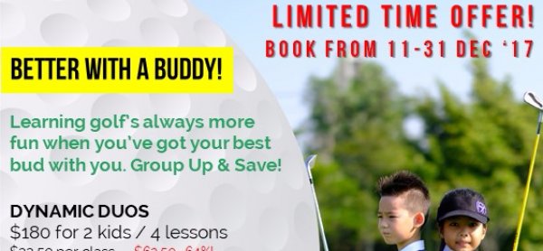 Purchase an exclusive Totts Golf Christmas special for a group of 2 or 3 kids and save up to 80% on class fees! Buddy up in a Dynamic Duo at $180 for 2 kids for 4 lessons or team up in a Terrific Trios at $150 for 3 kids for 4 lessons. What’s more, each child will even receive a complimentary golf tee - a perfect Christmas gift!