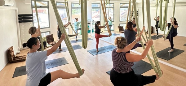 In our 60-90 mins Aerial Yoga Playdate Session: