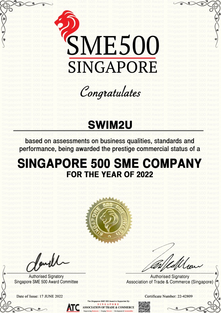 Swim2u Swim School is proud on being awarded the Singapore SME 500 Award 2022 by ATC (Association of Trade & Commerce) based on Company’s business resilience, performance and cleared assessments.